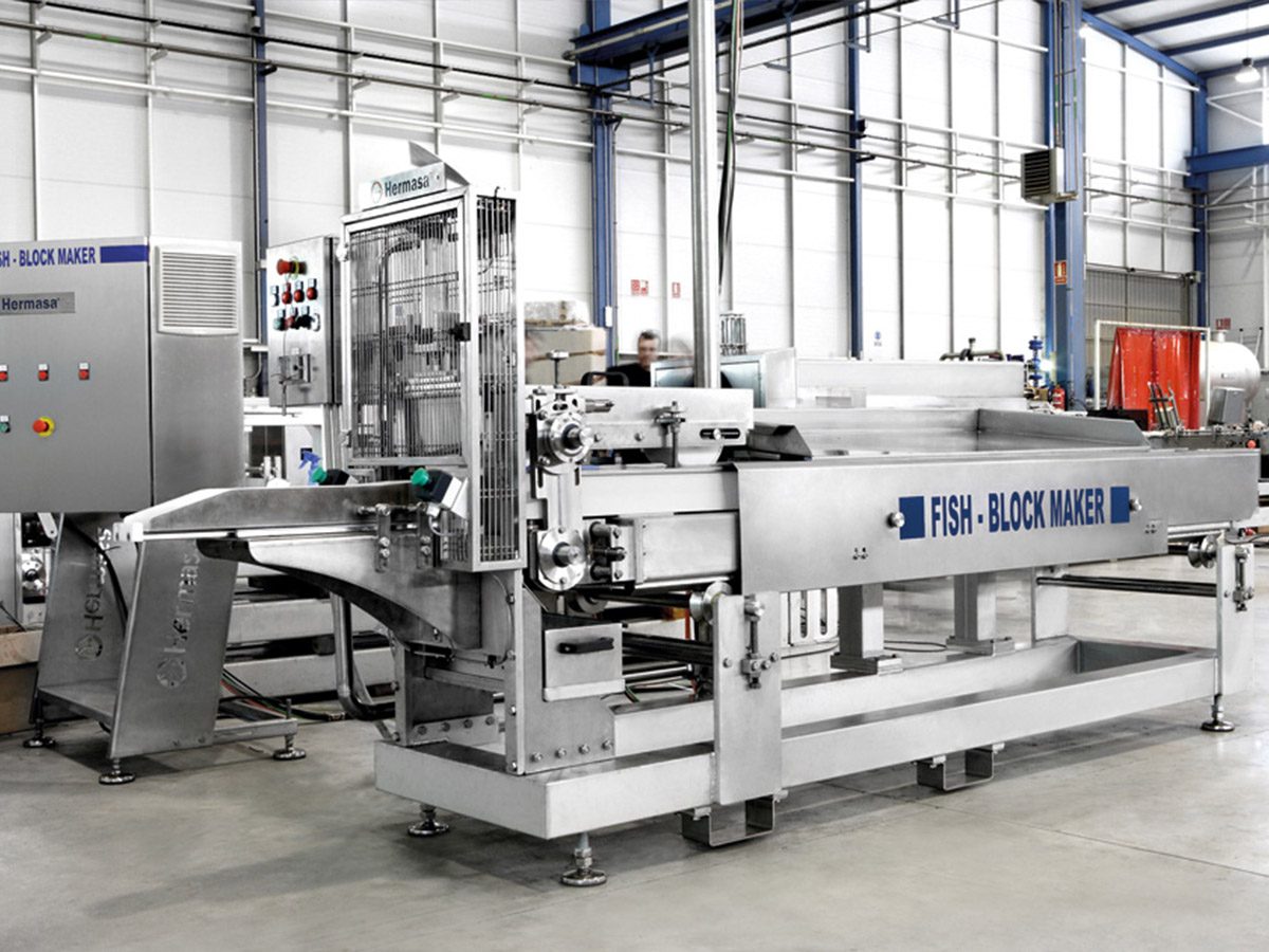 The fish is positioned on conveyors by a transfer system, designed and patented by Hermasa, it fills moulds that have been previously inserted in plastic bags, which then pass through vacuum, sealing and freezing.